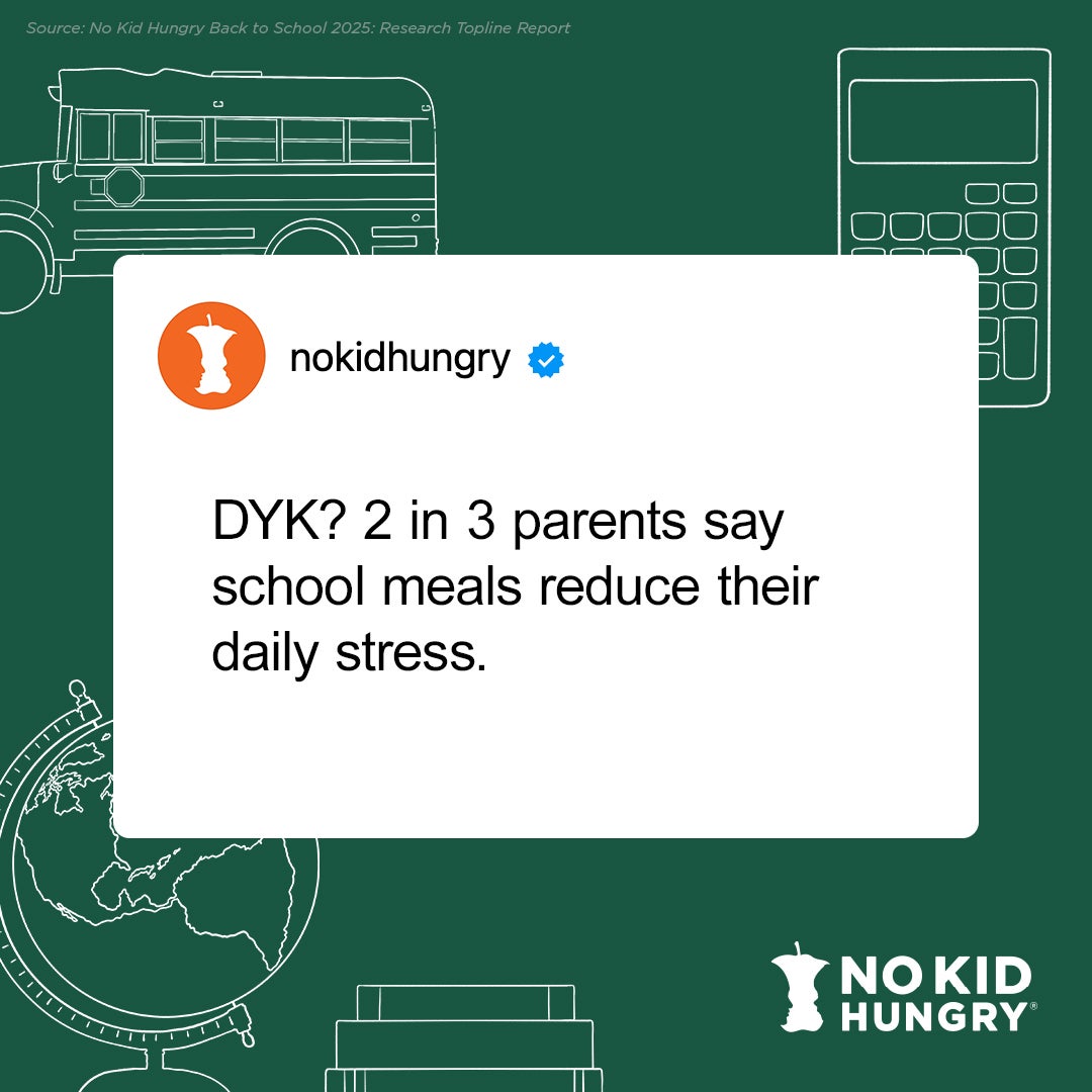 Most kids are excited for the new school year, to see their friends, teachers, and learn. However, for 52% of parents, the transition back to school and affording the clothes, school supplies, and other essentials their kids need for the school year often brings stress and worry. Having free school meals is a lifeline for parents, giving them one less thing to worry about. Learn more in this exciting new survey, conducted by @NoKidHungry at bit.ly/45tGkfP