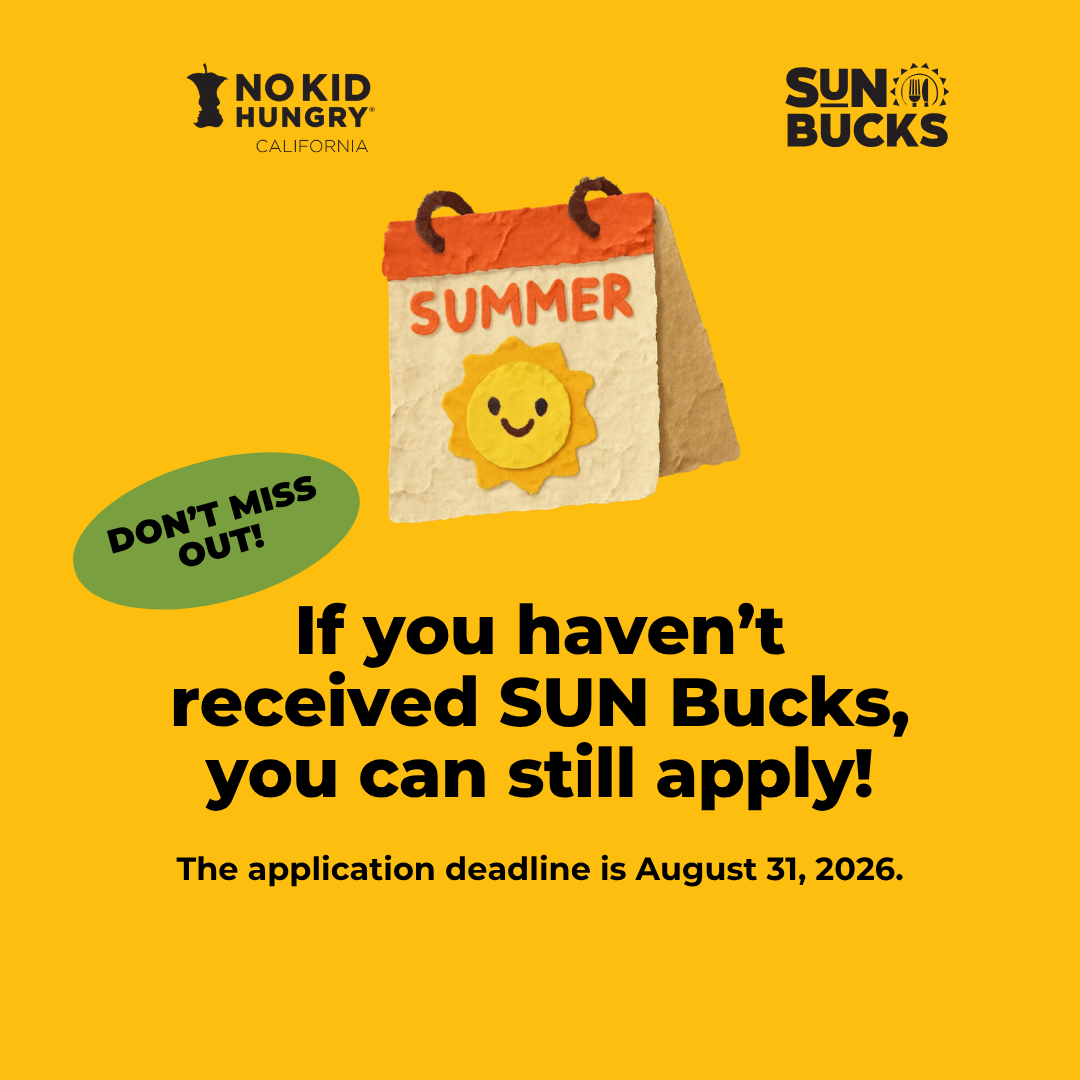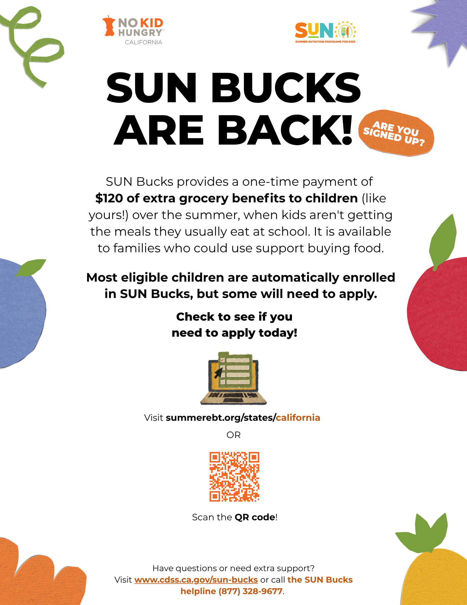 Sign up for $120 in extra grocery support over the summer! Visit SummerEBT.org/california to check SUN Bucks eligibility and if you need to apply.
