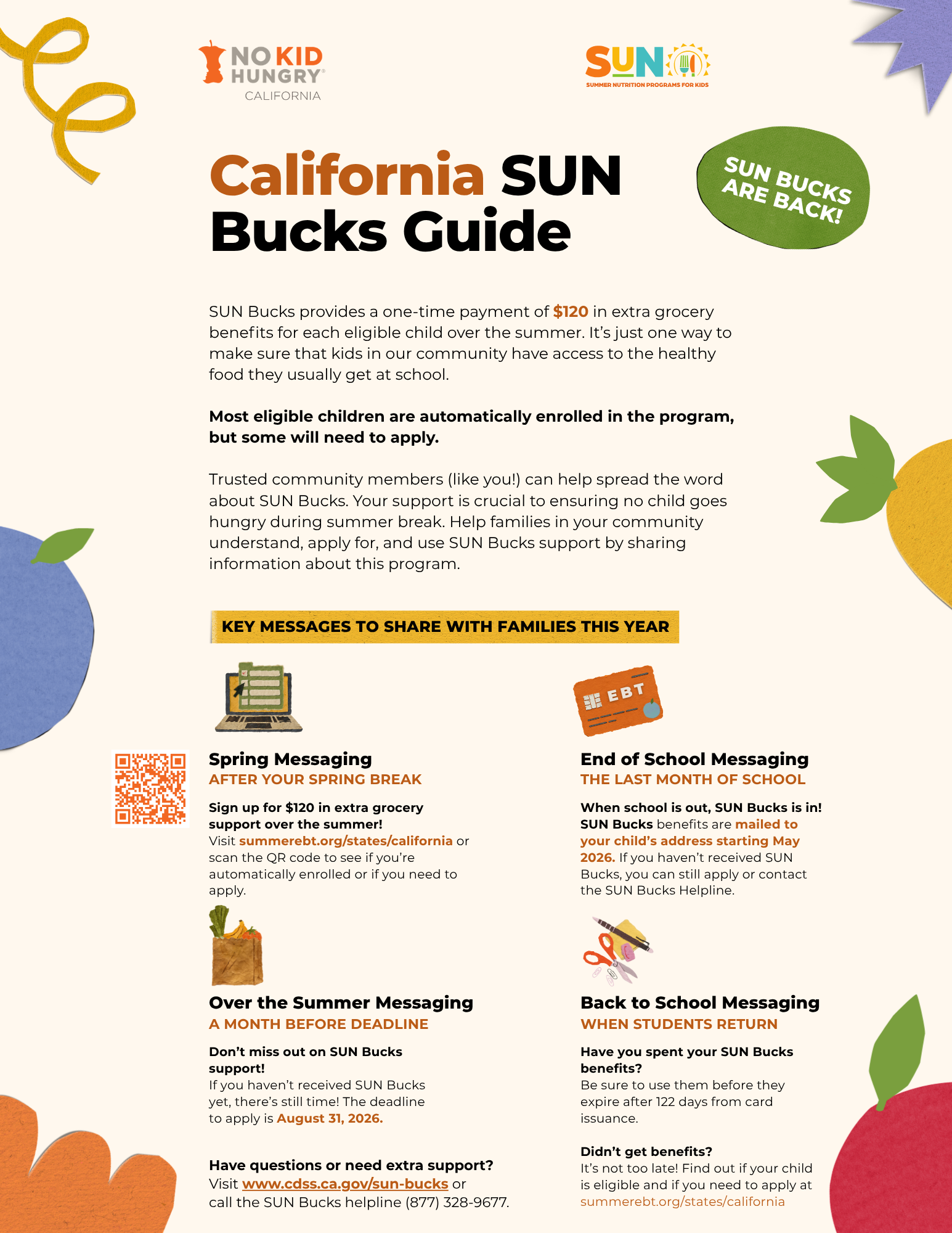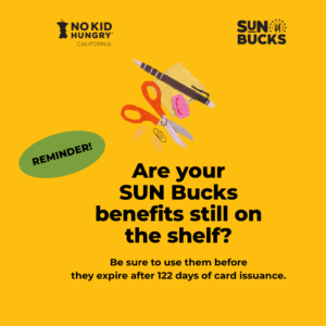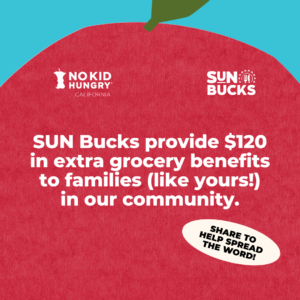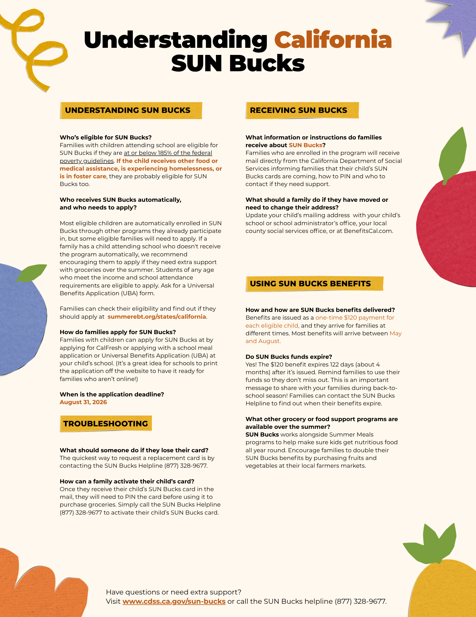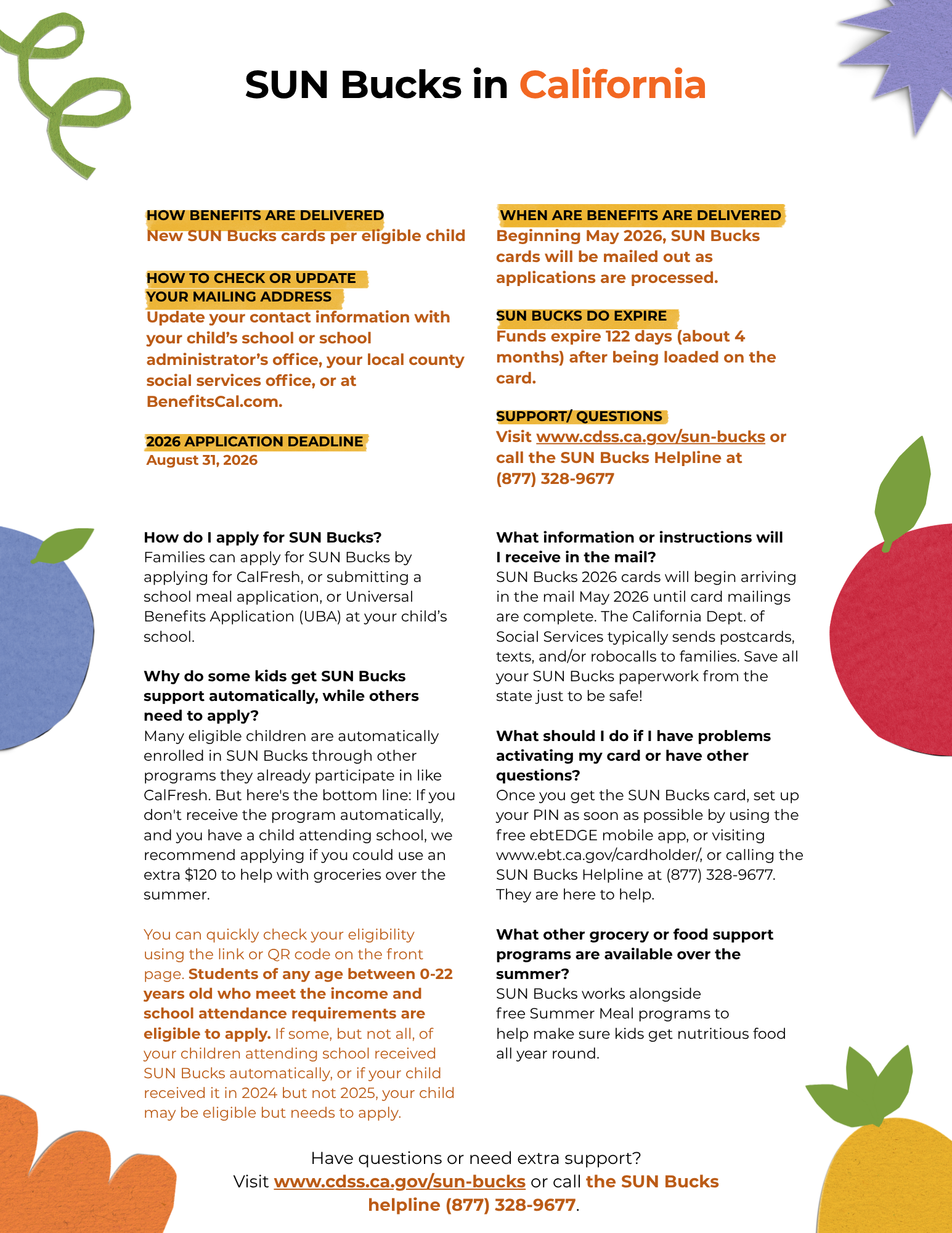 - For more up-to-date information and materials, visit the CA Department of Social Services‘ SUN Bucks page.