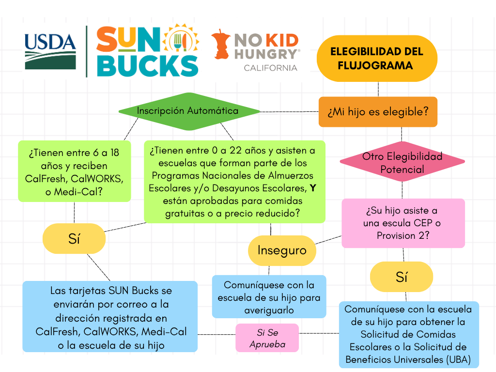 Las familias con niños de 0 a 22 años que califiquen para recibir comidas gratuitas o a precio reducido, y que no reciban CalFresh, CalWORKs o Medi-Cal (certificadas en un nivel igual o inferior al 185% del Nivel Federal de Pobreza), pueden presentar una solicitud de comidas escolares o una Solicitud de Beneficios Universales en la escuela de su hijo antes del 31 de agosto de 2026 para determinar si califican para los beneficios SUN Bucks en 2026, basándose en el tamaño del hogar y los ingresos. Para verificar si su hijo es elegible, solicite en la escuela de su hijo una solicitud de comidas escolares o una Solicitud de Beneficios Universales (UBA).