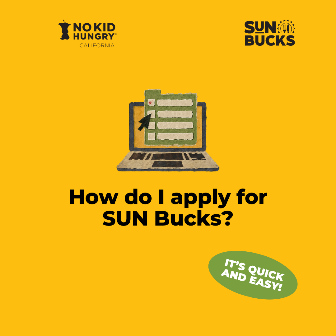 Most eligible children get SUN Bucks automatically. Other families must apply for SUN Bucks benefits at their child’s school. Getting and using SUN Bucks does not affect a family’s immigration status. Children who get SUN Bucks can still participate in other food assistance programs, like CalFresh and Summer Meal Programs.