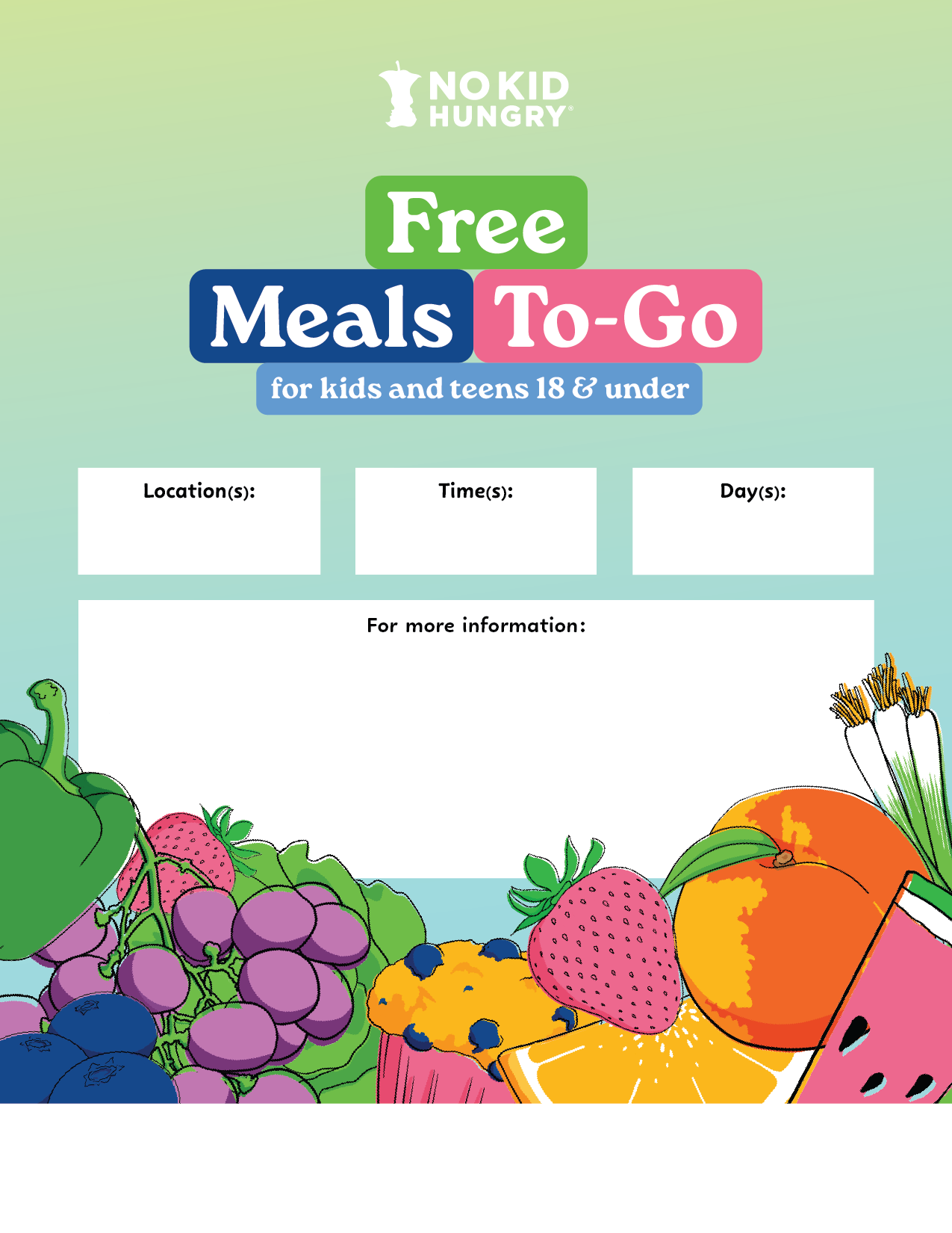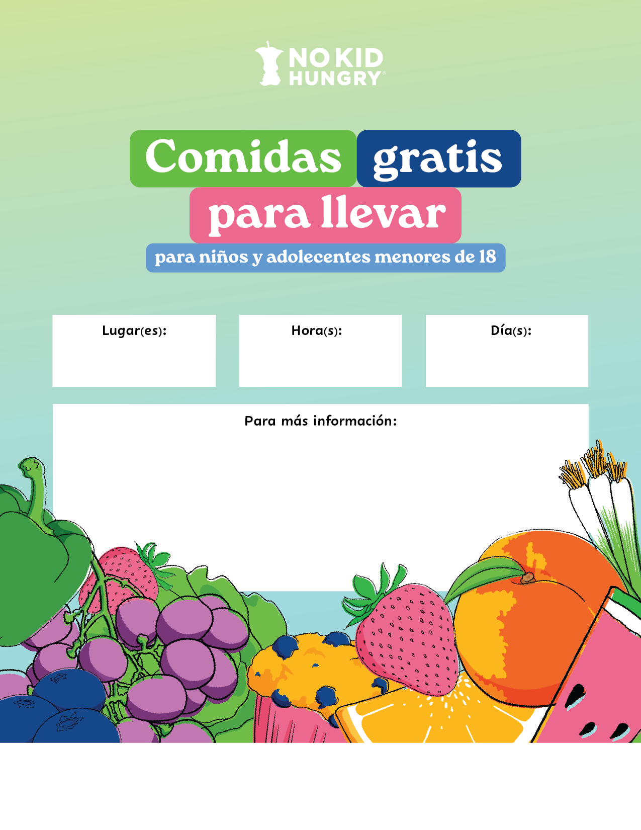 ¿Qué más puedo hacer para ayudar? Puedes compartir información sobre las comidas gratuitas de verano en las redes sociales con amigos, familiares, vecinos y con cualquier grupo comunitario o congregación religiosa a la que pertenezcas. Para encontrar un sitio de comidas gratuitas de verano cerca de ti, visita NoKidHungry.org/Ayuda. Para obtener recursos de comidas de verano, también puedes llamar a la línea nacional contra el hambre al 1-877-8-HAMBRE (1-877-842-6273).