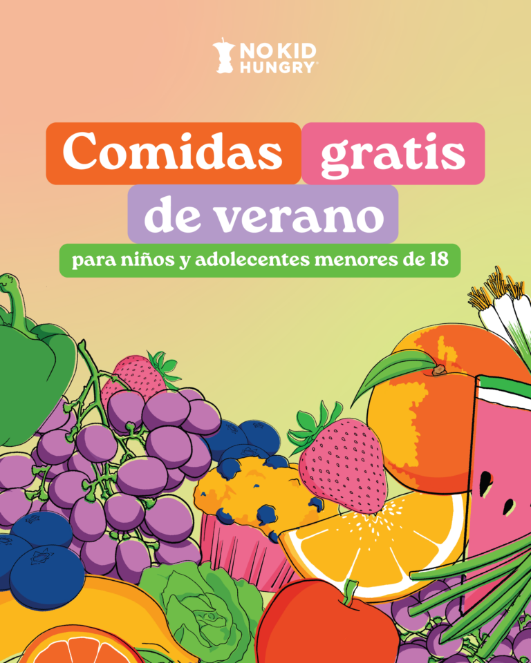 ¡Ahorra tiempo y dinero a tu familia con las comidas gratuitas para niños y adolescentes este verano! No es necesario presentar una solicitud ni inscripción; basta con pasar por allí y disfrutar. Para encontrar un sitio de comidas gratis de verano cerca de ti, visita NoKidHungry.org/Ayuda. También puedes llamar a la línea nacional contra el hambre al 1-877-8-HAMBRE (1-877-842-6273) para obtener recursos disponibles de comida de verano.