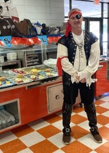 Bradley Pounders connects deeply with students, parents, and staff—bringing fun and enthusiasm to the cafeteria. Whether it’s dressing as a pirate to celebrate National School Lunch Week in 2024 or serving meals, his support for school nutrition is felt in every corner of the building.